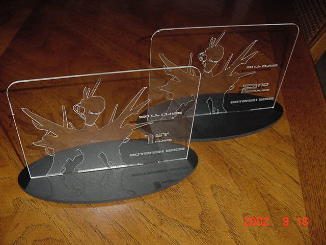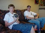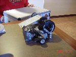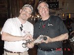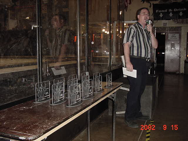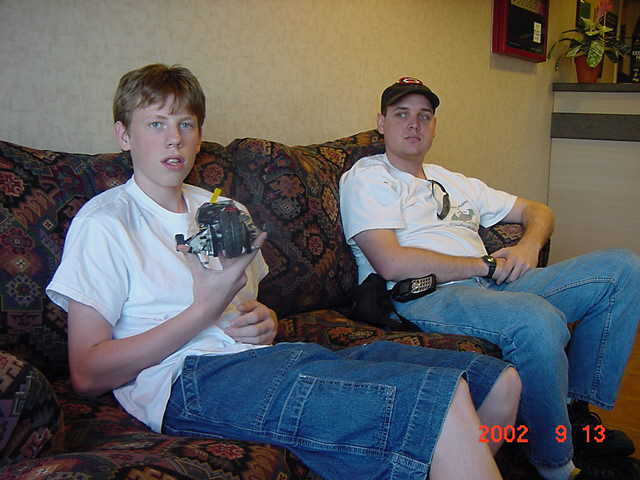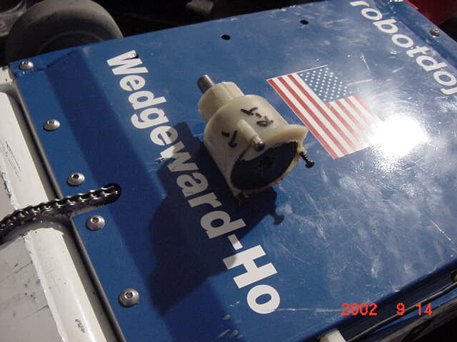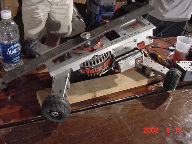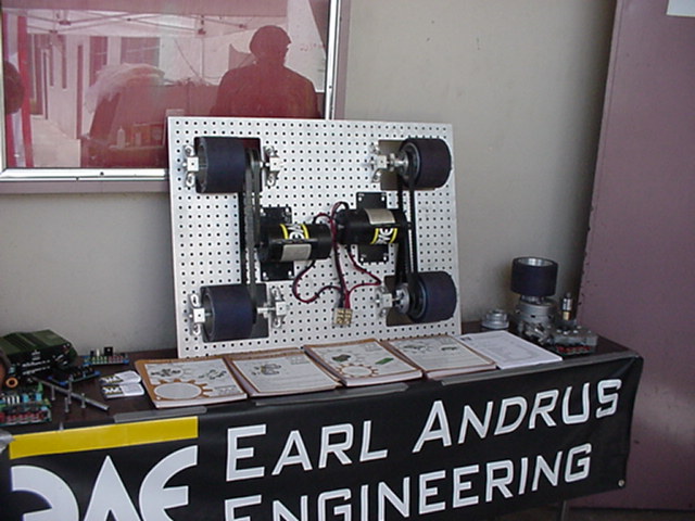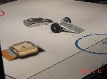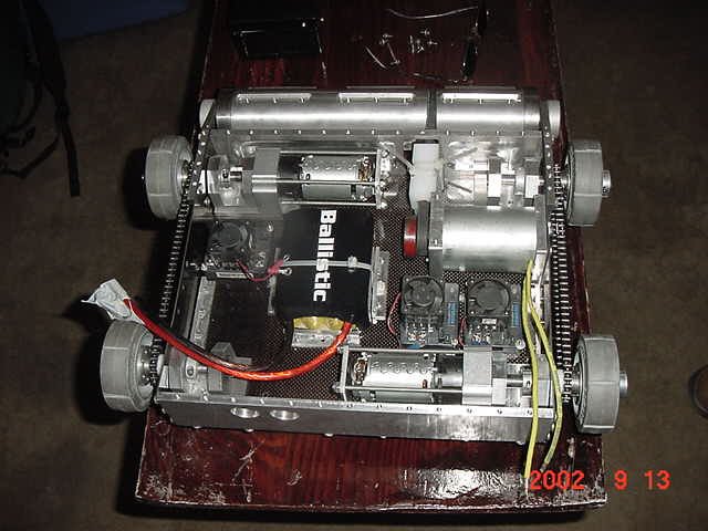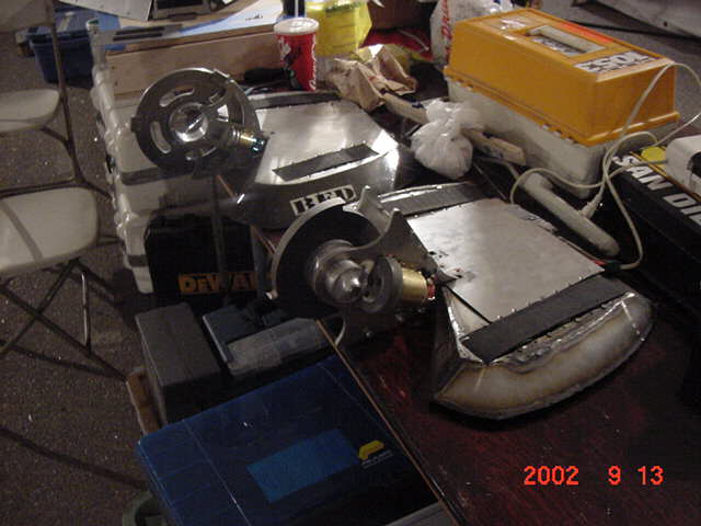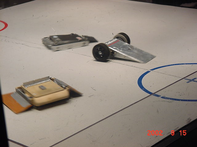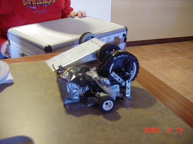 The 30lb bot, Helios from Team Cosmos (Ted Zeiger and Pete Covert) did the most tossing of its opponents, including Wedgeward-Ho, of all the bots there. You were glad when you drew Helios as a partner, but terrified if you were an opponent. Dan Danknick showed up with an Omni drive 60-lbder, called Archetype, with a spinning blade powered by..you won't believe it...an Etek! Donald Hudson showed up with just the front of an earlier revision of Dissector which he called Karcass. You were fortunate to pull Donald as a team mate as well. Don and Dawn Hudson were there on the tail end of their honeymoon. Congratulations you two!