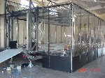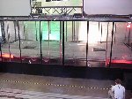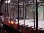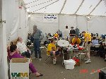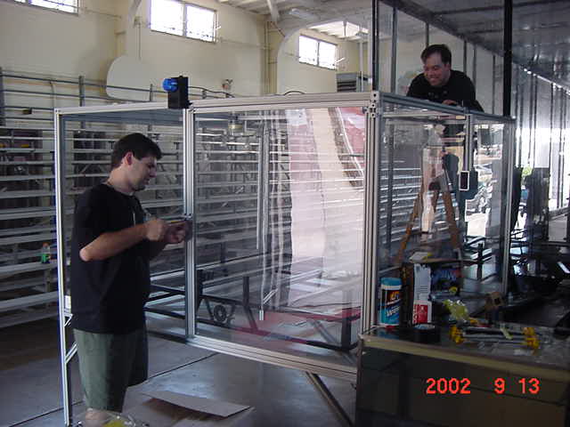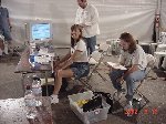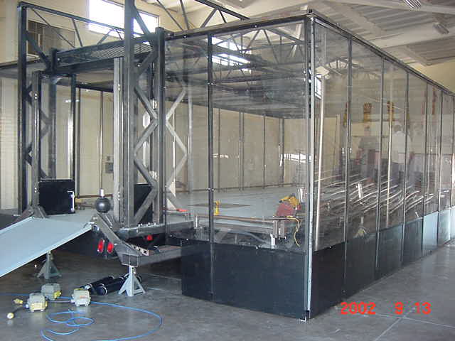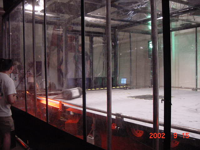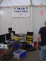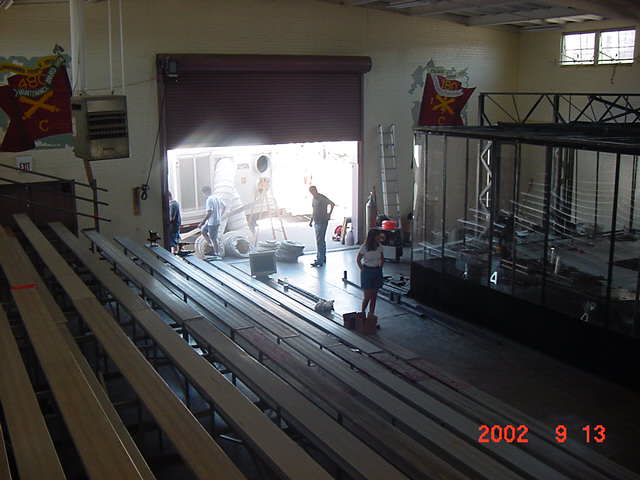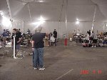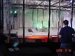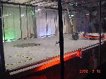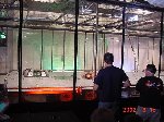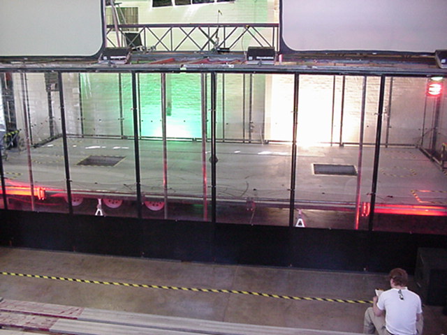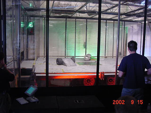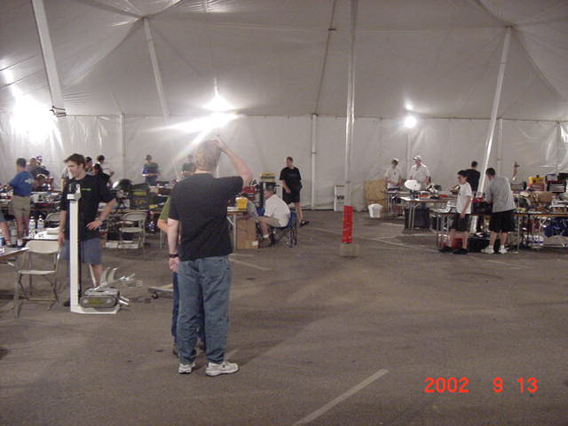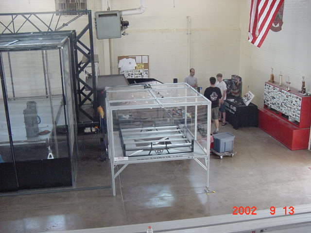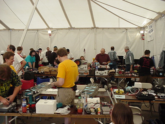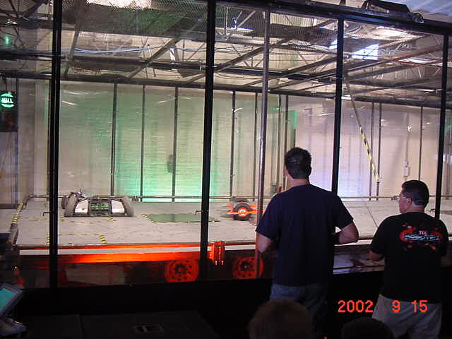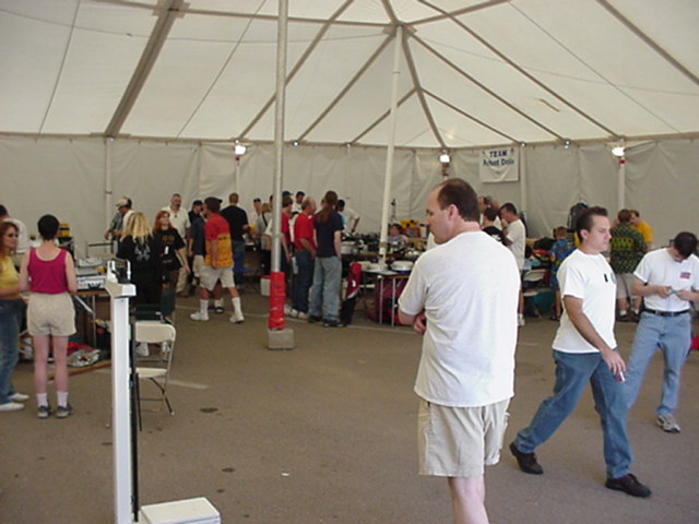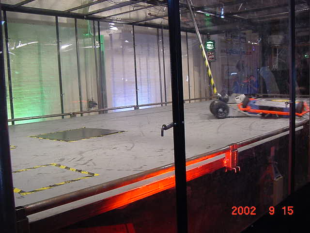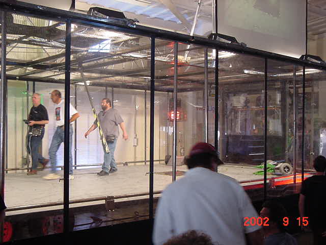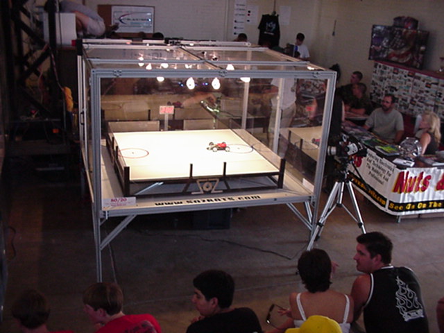 The official hotel for Botbash was the Quality Inn on University Ave in Tempe, AZ, which was just down the street from the campus. The National Guard armory, which was being used for the event was across the street from the Arizona State University Stadium. The arena was placed inside the building and the pits were located in a large tent alongside the arena. Both structures had air-conditioning brought in to make the otherwise sweltering weather bearable. The SOZBOT arena and bleachers were strategically placed in the armory, along with a bandstand, which was to provide 'industrial' music (I use the term 'music' here loosely), and overhead screens to allow full view of every fight for the audience.