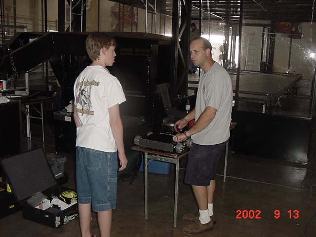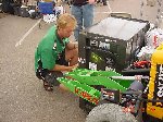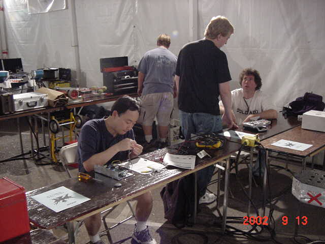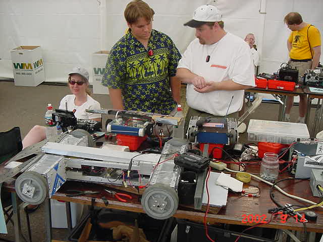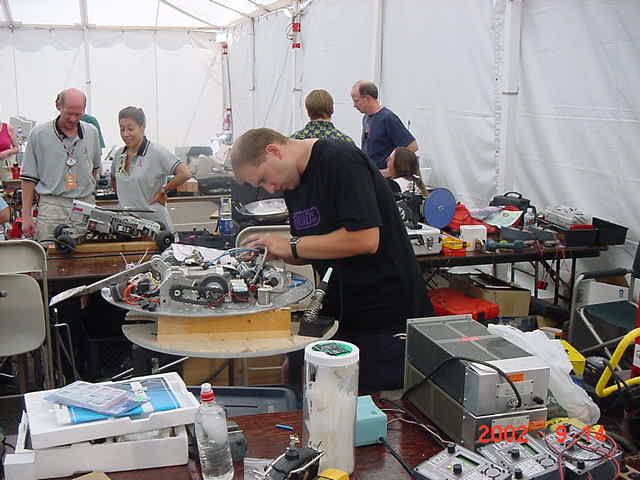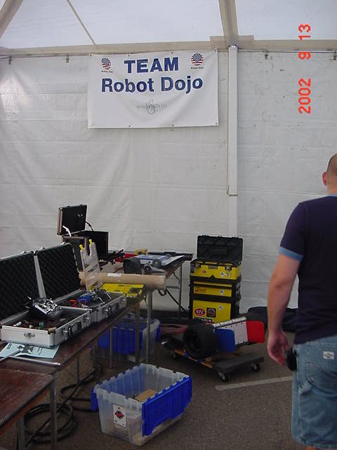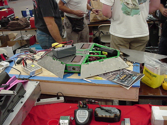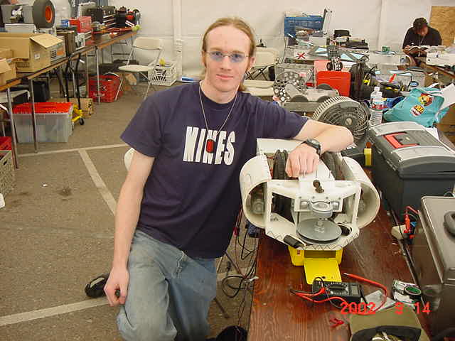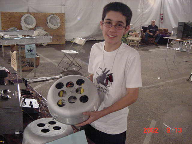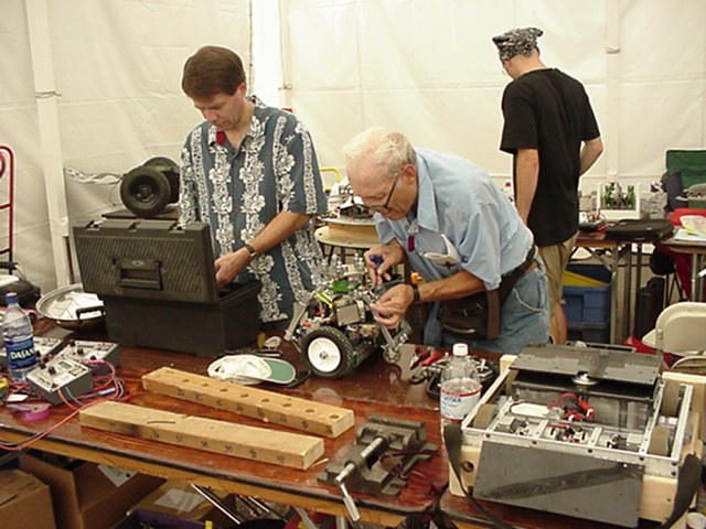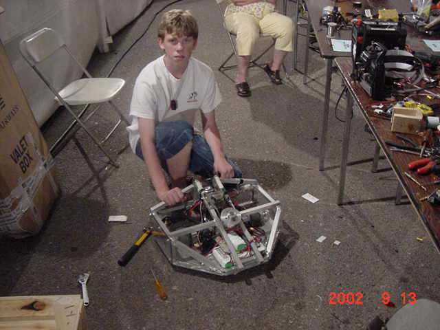 Besides our RobotDojo bots, there were many others from Colorado present to counter the many California bots. Ted Zeiger and partner Pete Covert brought Helios and Alpha Pujo, Derek Zahn brought SunFlower, Barry Anderson brought Worm Burner and there was a very nice family from Basalt, CO. Some competitors came as far away as the east coast, Tony and Sarah Hall from Massachusettes and young Devon from South Carolina. I spent most of friday helping Devon rewire his 60 lb bot D2, although I had originally planned on sleeping the whole afternoon back at the hotel since we drove all through the night getting there after work.
