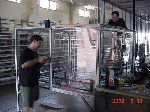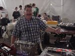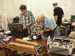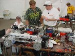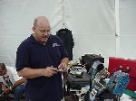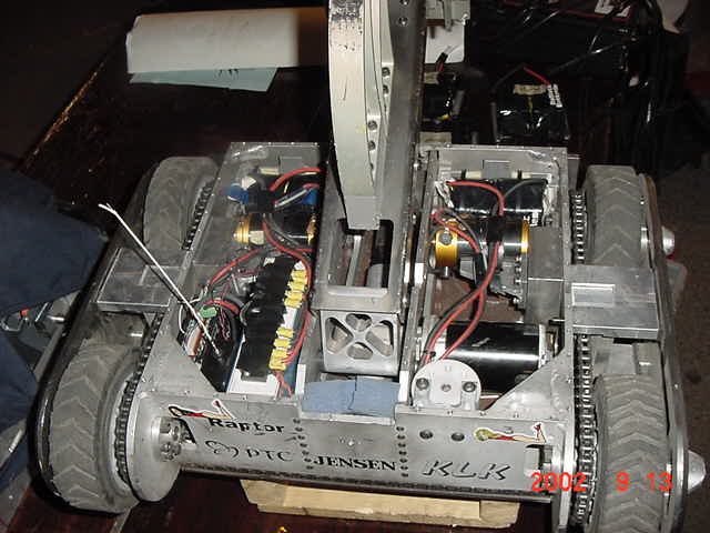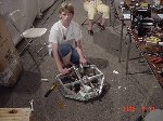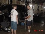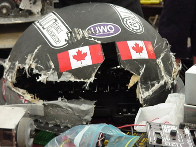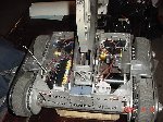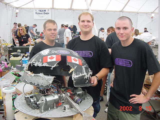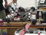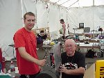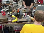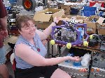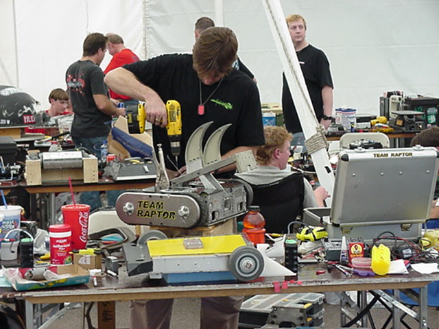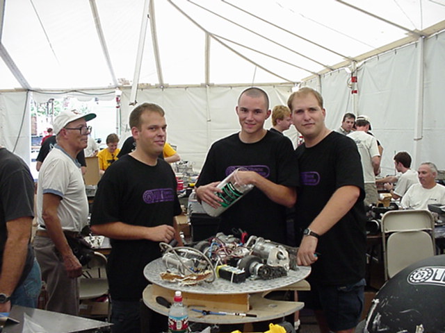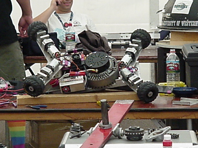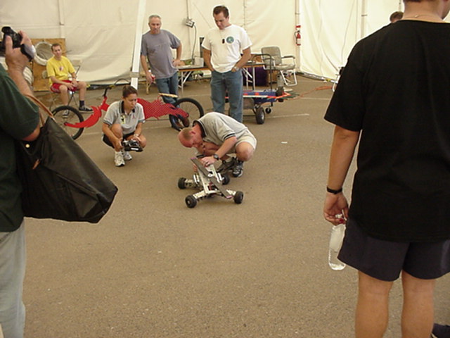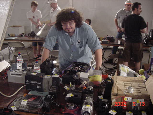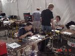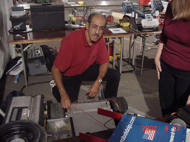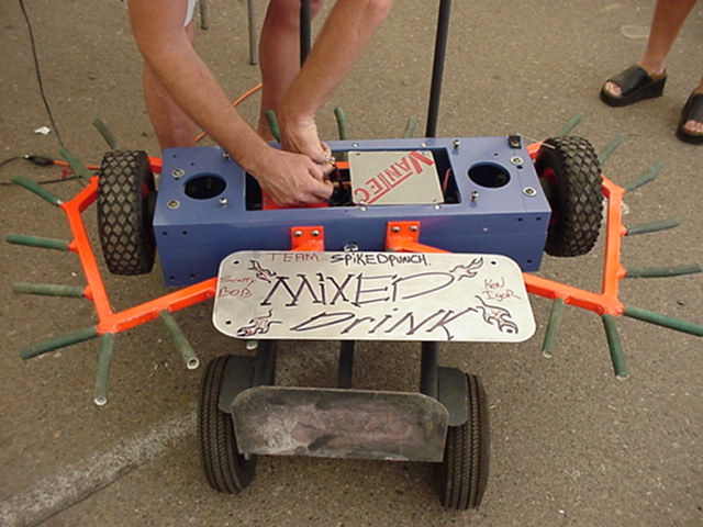 Besides our RobotDojo bots, there were many others from Colorado present to counter the many California bots. Ted Zeiger and partner Pete Covert brought Helios and Alpha Pujo, Derek Zahn brought SunFlower, Barry Anderson brought Worm Burner and there was a very nice family from Basalt, CO. Some competitors came as far away as the east coast, Tony and Sarah Hall from Massachusettes and young Devon from South Carolina. I spent most of friday helping Devon rewire his 60 lb bot D2, although I had originally planned on sleeping the whole afternoon back at the hotel since we drove all through the night getting there after work.