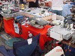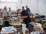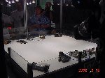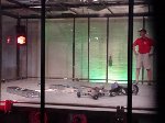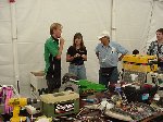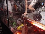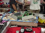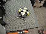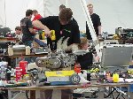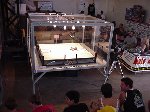 In this all-new-improved-robotic-combat, Bob designed Botbash for maximum crowd appeal and builder enjoyment, which involved teams of two bots competing against another two bots. Each time you fought you had different partners and different opponents. Lets see, the enemy of my friend is my enemy? or my friend? Anyway, you ended up fighting with or against everyone else. It made for great camaraderie and great sport as we combined strategy, skill and a lot of luck to try and make goals with a ball which refused to roll straight or to fight to the death in the Annihilator. There was also a capture-the-flag competition that a few of us competed in late the Saturday, but it was set aside Sunday to make everything else, including the 1lb SOZBOTS competition, happen on time. Since everything was double elimination, everyone fought at least 4 to 6 times (and more) so if you brought more than one bot (me) you were busy bot-puppy. The main ways to win were to actually get a goal with the ball, put your opponent into the pits, or just plain knock them over the 6 inch rail to the floor below. Most everyone spent some time on that floor alongside the arena trailer.