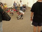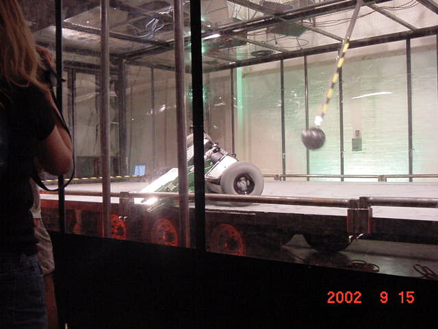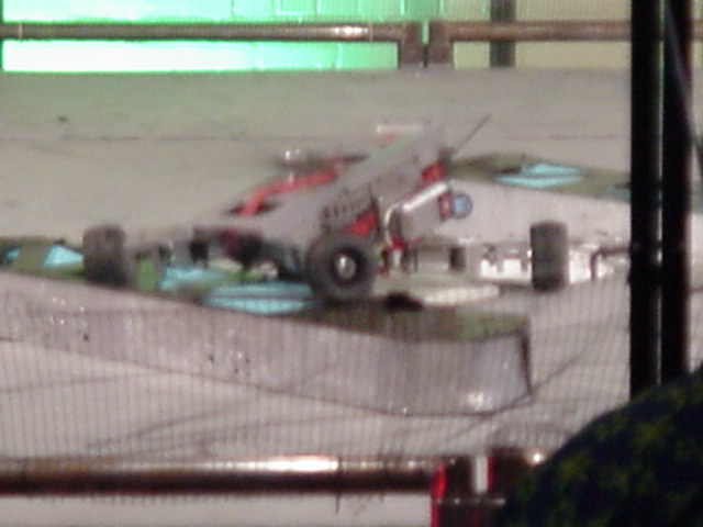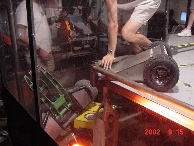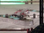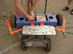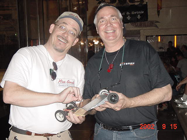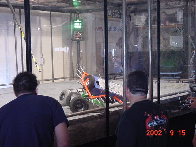 As far as my all-time favorite competitions for builders/drivers, I place BotBash second behind Robotica. The format is just great fun! Speaking of Robotica, Mark Joerger, The Robotica Series 1 champ was there as a judge, all the way from Oregon, and the two of us put on a short but decisive grudge match between us, as the two series 1 and 2 champions. Tinbender was doing well until it made a slip and got on top of Mark's Rat trap (which is an actual rat trap) and when the trap sprung it spit Tinbender out of the arena. Rats! Ok, Mark bring out Run Amok and we'll pit it against Flexy-Flyer!