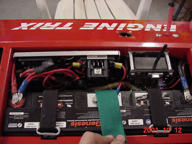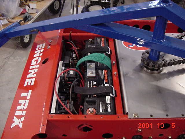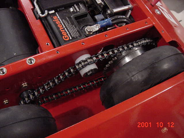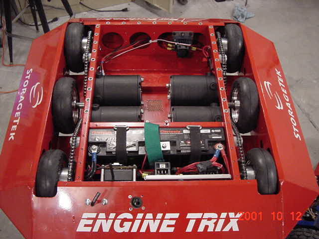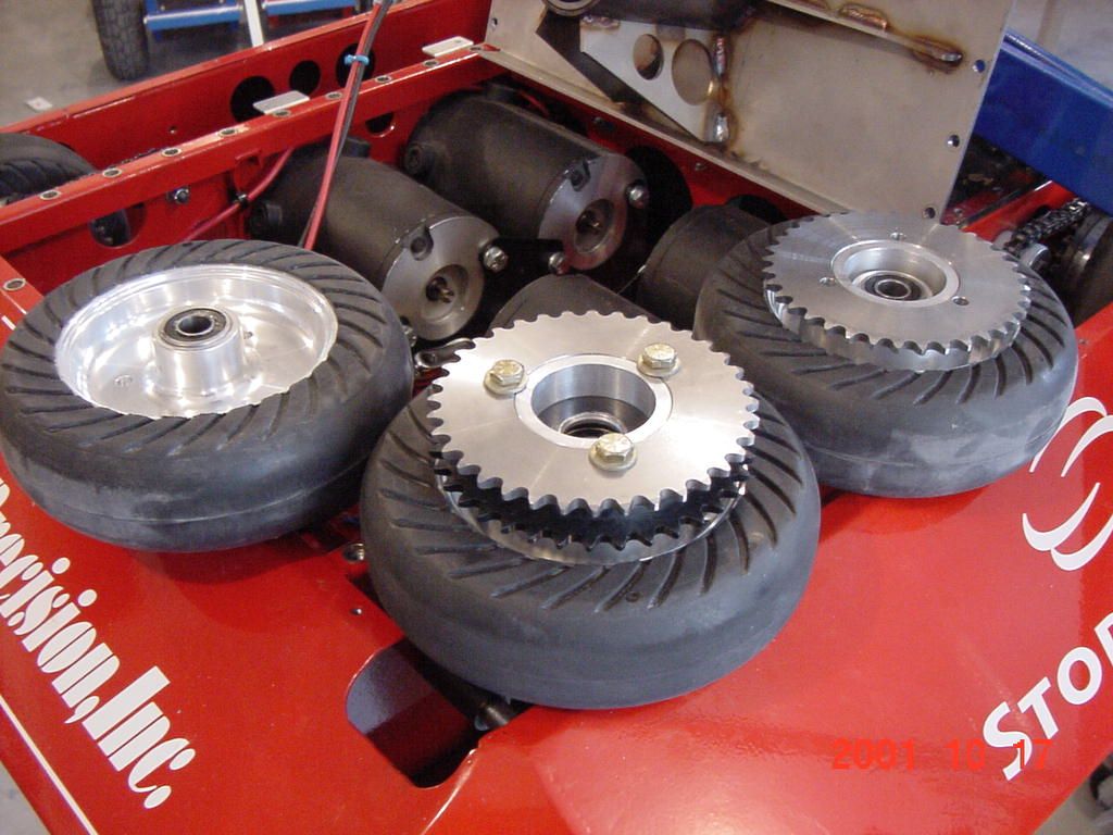 It has four motors driving 6 Racing Go-Ped wheels using a two stage chain drive system. It weighs in a 196 lbs and has a top speed of 5 MPH.