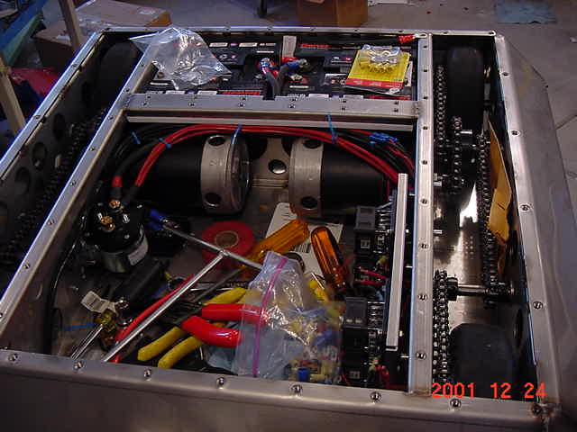 It has two motors (instaed of four) driving 4 (instead of 6) Racing Go-Ped wheels using a two stage chain drive system.
